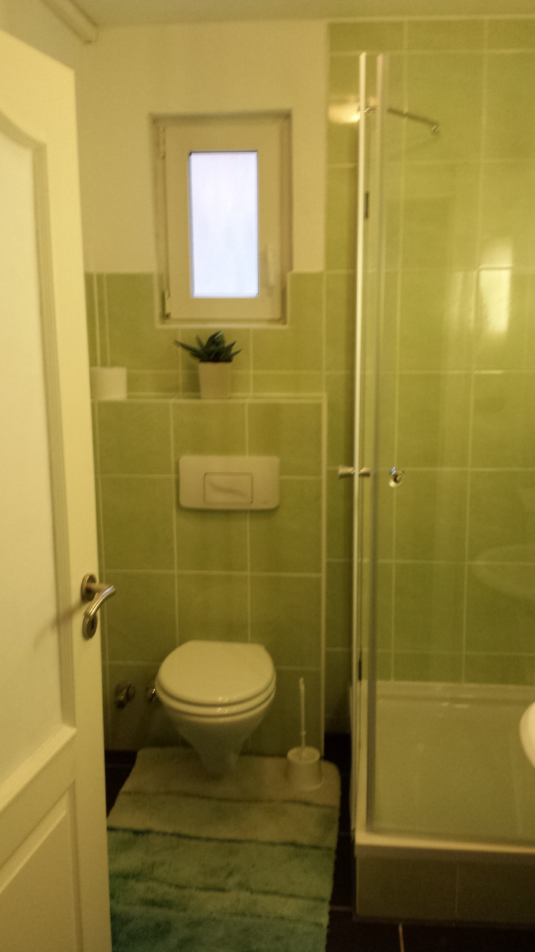 Das Badezimmer verfügt über eine Dusche, sowie ein WC und ein großes Waschbecken. Auch ein kleiner Satz Handtücher ist vorhanden.