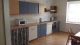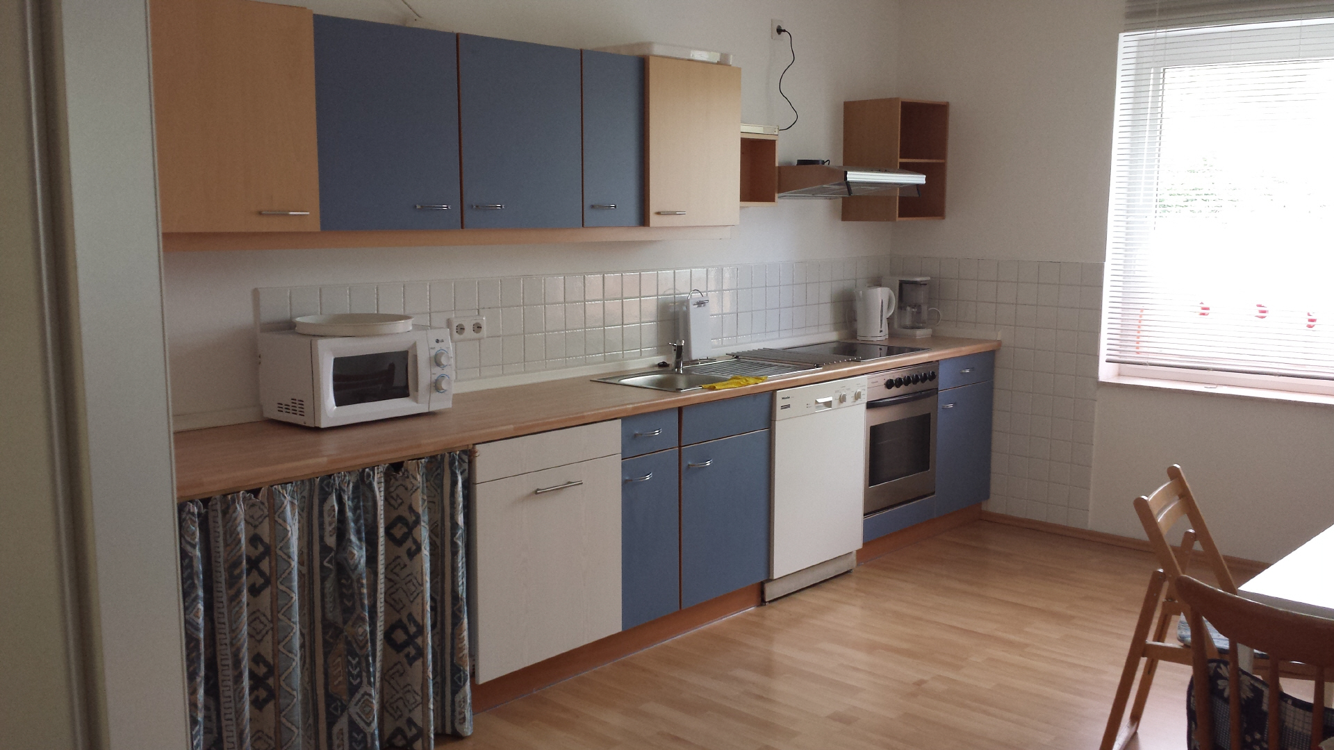 Die sehr geräumige Küche ist vollständig eingerichtet. Dazu gehören selbstverständlich ein Toaster, eine Kaffemaschine, ein Eierkocher, eine Spüle, ein großer Kühlschrank, ein Geschirrspüler, ein Ceran-Elektroherd, ein Backofen und ein Mikrowellenherd. Spül- und Geschirrtücher sind ebenfalls vorhanden.